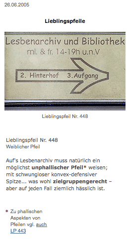 Es gibt in Berlin ein Lesbenzentrum, wo der Pfeil, ich habe mich echt hämisch gefreut, so zeigt. Diese Form ist eventuell weiblicher, als so. [K zeichnet] S: Ja. K: Oder weniger aggressiv. Oder defensiver. Ich weiß jetzt nicht, ob die Frauen das bewusst oder... ich hatte da jetzt keinen Nerv da zu klingeln und (spricht schnell und karikierend) „Schönen guten Tag, ich bin der Hanngann und will ghnudn... „ S: (lachen) K: (lautmalerisch) Dusch! (Soll wohl das Zuschlagen einer Tür lautlich verdeutlichen) Lachen Das ist schon interessant: oft sind das ja auch intuitive Entscheidungen. Und dass wirklich so ein Pfeil auf das Lesbenzentrum hinwies und nicht so ein knackiger, männlicher, phallischer, aggressiver Pfeil... so was interessiert mich dann. S: Ja. K: Oder: was ist das für jemand, der so eine runde Pfeilspitze (Anspielung auf Erik?) macht? Vielleicht ein sehr sanfter Mensch? Oder auch gerade nicht? Keine Ahnung. |