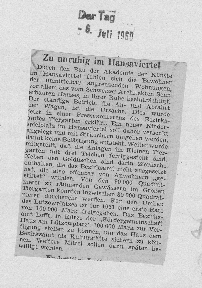 Die Akademie der Künste am Hanseatenweg in den frühen 60er Jahren. Foto Akademie der Künste, Berlin, Baukunstarchiv