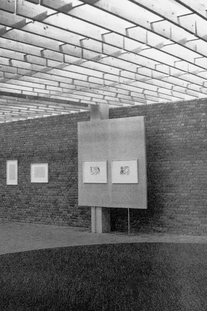 Detail der Ausstellungsarchitektur der Paul-Klee-Ausstellung in der Akademie 1960/61, Ausstellungsarchitekt Lothar Juckel.